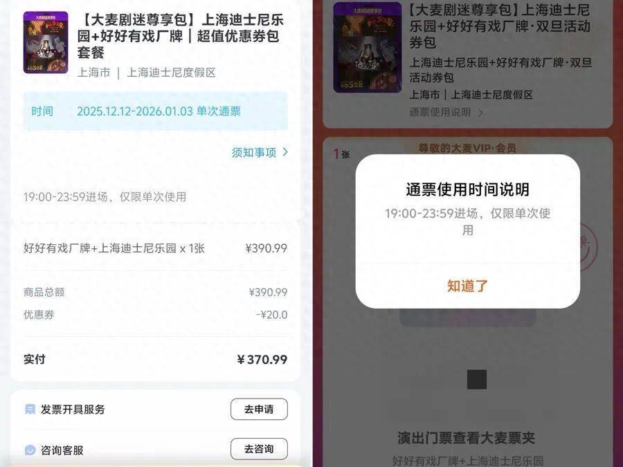 旧年12月30日晚间,市民江先生在看到大麦App推送的“上海迪士尼乐土+好好有戏厂牌”的作为告白。思到不错借此庆祝跨年,又是较为优惠的价钱,他在莫得仔细阅读购买确定情况下,果决支付了742元,购买了2份套餐。其时支付界面大字粗体强调“迪士尼乐土”以及“2025.12.12-2026.01.03单次通票”字样,露出了他们带有个东谈主身份证信息的票夹,令他误合计已告成购买了乐土门票。