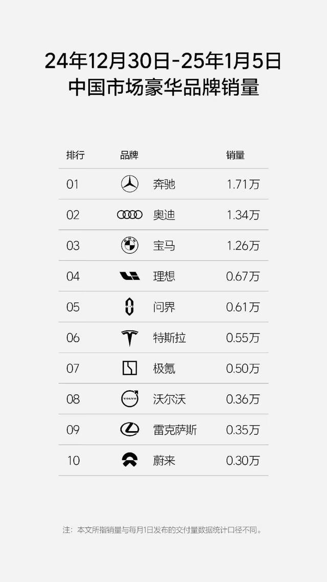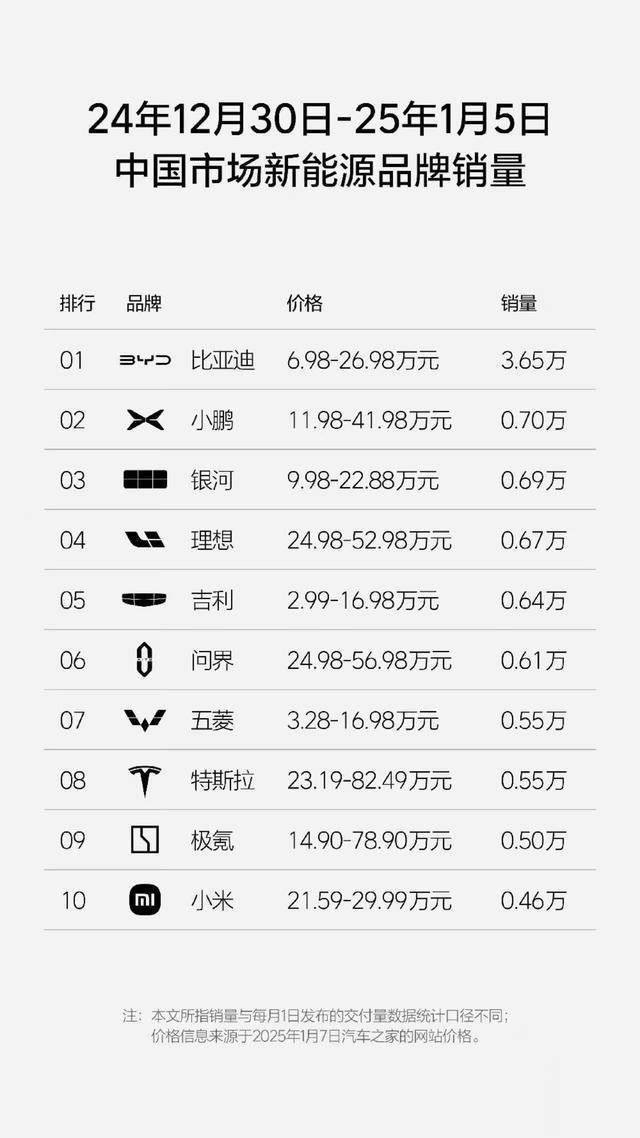 新势力周销量榜单中,理念念被动退位,2024年永久的的第一在2025年第一周就被小鹏汽车挤下神坛。