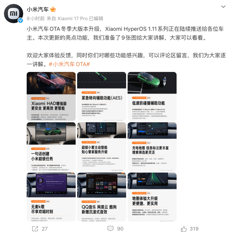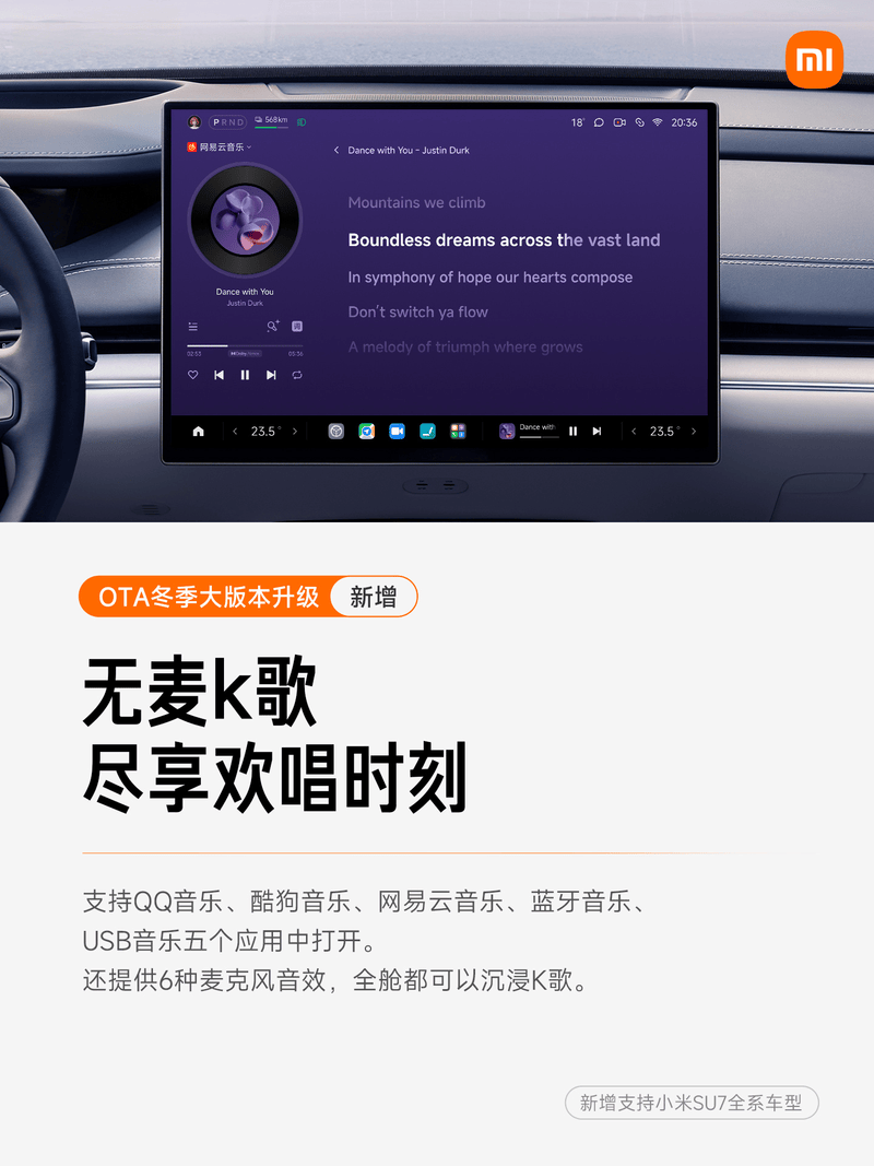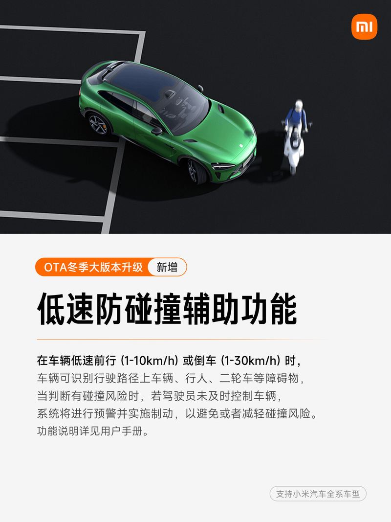 易车讯 12月25日,小米汽车官方告示开启冬季大版块升级,Xiaomi HyperOS 1.11系列正在持续推送。本次OTA升级新增伏击转向赞成功能、新增低速防碰撞赞成功能、新增无麦K歌等。