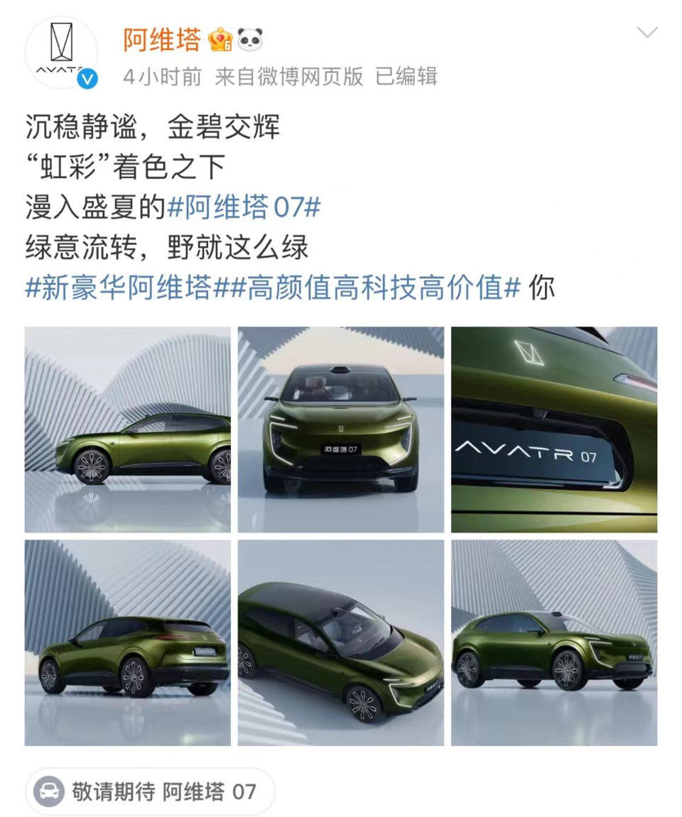 7月10日,咱们从阿维塔官方获悉,阿维塔旗下中型SUV——阿维塔07发布了一组新配色的官图。依据此前了解的信息,该车将搭载华为高阶智能驾驶系统以及HarmonyOS鸿蒙座舱,提供纯电和增程式混动两种能源版块,瞻望售价在25-35万元区间。值得一提的是,新车将在三季度开启预售,或将于9月份上市。