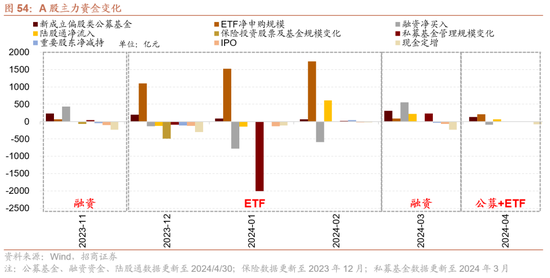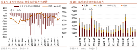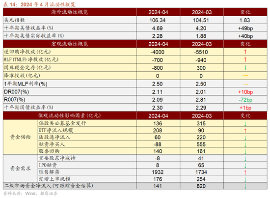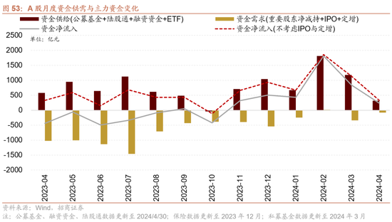 流动性与资金供需:外资回流有望改善A股资金供需结构。流动性方面,由于4月政府债券刊行量不大、逆回购到期量较小等因素,市场流动性合座较为充裕,稳健季节性限定,各品种资金利率牢固运行,资金分层征象缓解。好意思国4月ISM制造业PMI回落至收缩区间,好意思国4月非农管事东说念主口增幅显耀不足预期,失业率不测上升,薪资增幅放缓。经济降温下市场对好意思联储首次降息预期从11月提前至9月,好意思国国债收益率下落,好意思元指数大幅走弱。股市资金供需方面,4月股票市场可追踪资金供需均有所收窄,资金供需紧均衡。资金供给端,新发基金范围有所回落但仍然孝敬主力增量资金;ETF小幅净流入,孝敬部分增量资金;陆股通旯旮转为大幅净流入;融资资金由大幅净流入转为净流出。资金需求端,重要股东由此前净减持转为净增持;IPO与再融资范围再度回落。4月的主力增量资金方面,公募基金孝敬主力增量资金,同期ETF、北上资金均有不同程度净流入。预测5月,在国内经济预期改善,好意思国国债收益率下落,好意思元指数大幅走弱布景下,外资有望连续回流改善A股资金供需结构。