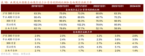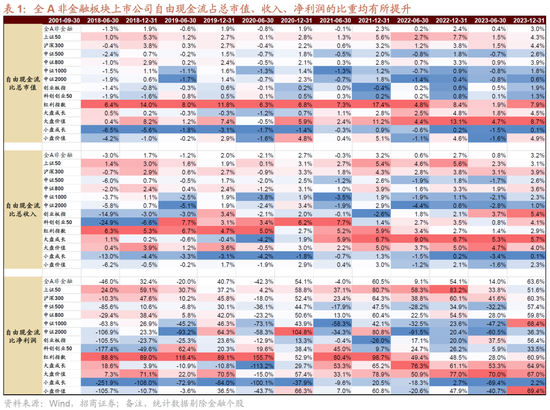 限制2023年底,全A非金融板块上市公司摆脱现款流占总市值、收入、净利润的比重均有所提高。其中全A非金融板块2023年摆脱现款流占总市值的比重由2022年的2.4%提高至3.0%,主要指数中大盘价值、红利指数、大盘成长占比相对较高。摆脱现款流占总收入的比重由2022年的2.7%提高至3.2%,主要指数这一占比宽绰提高。摆脱现款流占净利润的比重方面,全A非金融由2022年的54.1%提高至63.6%,主要指数中中证1000、创业板指、中证500、红利指数等提高较多。