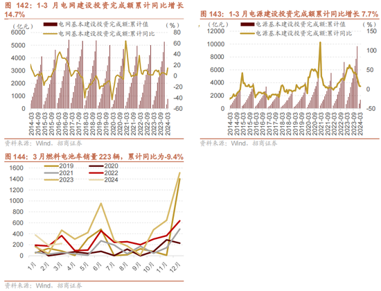 电网和电源建设稳步开展,燃料电板汽车销量累计同比上行。凭证Wind数据,1-3月电网建设投资完成额累计同比增长14.7%,同比增速较前一月上行;1-3月电源建设投资完成额累计同比增长7.7%,同比增速较前一月下行;3月燃料电板车销量223辆,相较于2月的188辆月销量环比上升19%,1-3月销量累计同比下行至9.4%。
