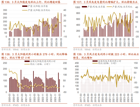 3月太阳能发电同比增速回落,3月风电发电同比增幅扩大。数据自大,3月太阳能发电量环比上行47.76%,同比增速15.80%,较前一月同比增速回落1.44个百分点;3月太阳能利用小时数为279小时,同比下降10小时,环比下降57小时。风电方面,3月风电发电量同比增幅扩大,环比无间为正,同比上升16.8%,环比增多11.15%,3月风力发电利用小时数为223小时,同比增多9小时,环比下降150小时。
