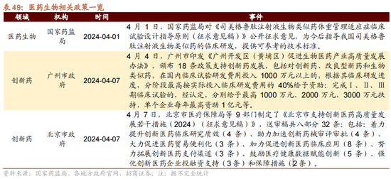 医药生物方面,主要聚焦立异药办法。4月4日,广州市印发《广州开发区(黄埔区)促进生物医药产业高质地发展办法》,颁布18条政策支柱立异药发展,包括对立异药、矫正型新药和生物类似药,在国内临床查验研发用度参加1000万元以上的,凭证其临床研发程度,分阶段最高按骨子参加临床研发用度的40%给以资助:完成Ⅰ、Ⅱ、Ⅲ期临床查验的,经认定,分别给以最高1000万元、2000万元、3000万元援助,单个企业每年最高资助1亿元等。4月7日,北京市医疗保险局等9部门制定了《北京市支柱立异医药高质地发展些许规律(2024)(征求倡导稿)》,送审稿共八部分32条:包括:服从提高立异医药临床筹商质效(4条)、助力加速立异药械审评审批(4条)、逍遥促进医药贸易便利化(3条)、加力促进立异医药临床应用(8条)、勤苦拓展立异医药支付渠说念(3条)、饱读动医疗健康数据赋能立异(5条)、强化立异医药企业投融资支柱(3条)和保险规律(2条)。