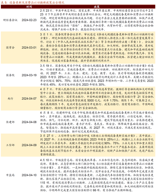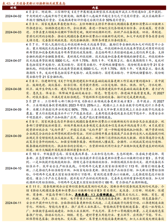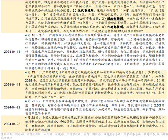 在总量政策方面,开辟更新消费品以旧换新仍为稳增长的主要抓手。开辟更新及以旧换新的《行径决议》印发后,政策体系逐步完善,各部委的支柱政策逐步落地。限制四月,据不完全统计,国度发改委、央行、商务部、住建部等多部门已印发开辟更新及消费品以旧换新专项政策,“1+N”政策体系不断完善。具体来看,4月7日,央行晓喻树立科技立异和期间改造再贷款对额度、期限、对象等方面作念出章程。随后各部分政策频出,近期工信部等七部门合资印发《推动工业领域开辟更新实施决议》,住建部发布《鼓动建筑和市政基础设施开辟更新管事实施决议》,要求更新淘汰使用跨越10年以上、高浑浊、高耗能、老化磨损严重、期间落伍的建筑施工工程机械开辟;4月11日,国务院新闻办公室举行国务院政策例行吹风会。国新办举行国务院政策例行吹风会,先容《推动大范围开辟更新和消费品以旧换新行径决议》接洽情况,发改委、工信部、财政部、住建部、商务部、市监局等部门参加,进一步推动开辟更新政策落地。随后广州、北京等多地发布行径详情推动“大范围开辟更新”政策落地。