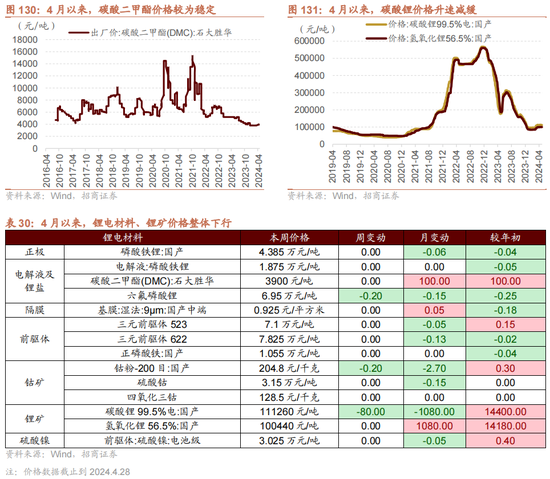 4月以来,锂电材料价钱合座保管结识。据Wind数据自大,碳酸二甲酯出厂价为3900元/吨(限制24/4/28),碳酸锂价钱为11.12万元/吨(限制24/4/28)。