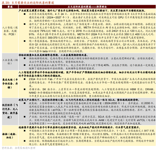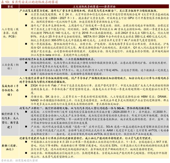 行业采用层面,短期围绕事迹改善办法,中耐久怜惜盈利和产能蔓延出现拐点的办法。轮廓商量前期表现、估值、交易活跃度、景气变化、政策和事件催化,咱们建议要点怜惜科技成长领域的电子、诡计机、医药生物、国防军工;消费周期领域细分行业的龙头,食物饮料、家电、有色、汽车、机械等。5月要点怜惜五大具备旯旮改善的赛说念:AI算力(服务器、光模块,PCB) 、工业金属(铜、铝)、集成电路(存储芯片、半导体开辟)、低空经济(遨游汽车、数字基建、无东说念主货运)、船舶(造船、油运)。