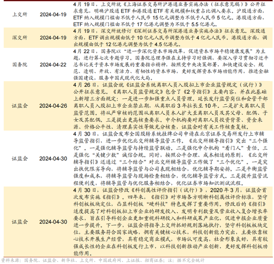 新“国九条”“1+N”政策体系不断完善,配套政策无间出台。4月12日国务院出台新“国九条”后。尔后。证监会接连发布新“国九条”配套政策,从刊行监管、上市公司无间监管、退市监管、交易监管等多方面优化政策体系,包括5项成本市场对港合作规律、对于成本市场服务科技企业高水平发展的十六项规律、《公开召募证券投资基金证券交易用度照料章程》、《证监会系统下野东说念主员入股拟上市企业监管章程(试行)》等文献。