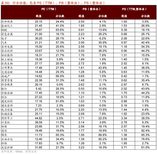 分行业来看,国防军工、诡计机、电子、好意思容照管、医药生物的估值水平高于其他行业,银行、建筑胁制、煤炭、石油石化、交通运送水平较低,其中银行的估值水平处于末位。