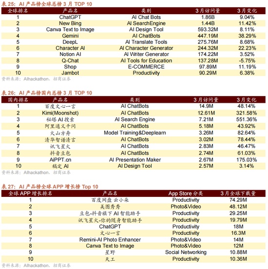 3月全球AI家具(包含Web 跟 APP)榜名次前十的有9家打听量上升,其中ChatGPT打听量上升9.04%,New Bing打听量上升11.42%,Canva Text to Image上升8.11%,国内AI家具榜名次前十打听量全部上升。从手机端AI应用看,3月全球和国内下载量名次前四均为百度网盘、好意思图秀秀、豆包和讯飞星火。