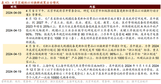 区域政策方面,据不完全统计,四月广东、浙江、上海等地区分别推出《广东省推动大范围开辟更新和消费品以旧换新实施决议》、《浙江省推动大范围开辟更新和消费品以旧换新些许举措》、《上海市促进汽车消费补贴实施详情》,以旧换新区域性支柱政策逐步落地。