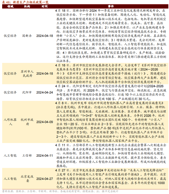赛说念及产业趋势投资:政府密集出台低空经济政策,聚焦遨游汽车、无东说念主货运、数字基建三大细分赛说念。投资契机一:遨游汽车,eVTOL期间领有低杂音、低成本、高资源利用率等上风,多家制造业纷繁布局遨游汽车行业,推动遨游汽车民用化、买卖化进程,加速低空经济产业发展。投资契机二:无东说念主货运,“低空经济+物流” 是目下买卖应用最庸碌的场景,多家物流公司纷繁布局无东说念主机物流领域,部分外卖平台也在尝试使用无东说念主机配送模式。投资契机三:数字基建,基于通讯感知一体化期间,依托蜂窝迁移通讯蚁集等基础设施,构建通讯、感知、智算一体化的低空蚁集,措置低空经济发展痛点,助力低空经济快速发展。政策端:四月主要有四大办法的产业政策值多礼贴:1)新质坐褥力,主要聚焦低空经济和东说念主工智能;2)数据要素,国度数据局印发《数字社会2024年管事要点》;3)双碳/快意储,“千乡万村驭风行径”开展,县域充换电设施补短板试点管事开启;4)医药生物,地方性立异药支柱政策陆续出台。