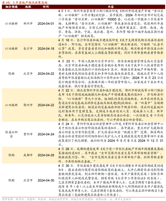 需求侧方面,北京、成都等城市无间优化限购政策,房地产“以旧换新”大范围开展。具体来看,4月22日,北京市个东说念主住房贷款中住房套数认定尺度执行口径作出如下报告:2024年4月23日后缔结购房网签合同,且分手不悦一年的房贷央求东说念主,如家庭名下在本市无成套住房,执行首套房信贷政策。在30日,北京市住房城乡建设委发布《对于优化调整本市住房限购政策的报告》,忽视在执行现存住房限购政策的基础上,允许已领有住房达到限购套数的住户家庭,到五环外新购一套住房。此外,4月28日,成都住建局发布《对于进一步优化房地产市场牢固健康发展政策规律的报告》,其中忽视“全市范围内住房交易不再审核购房资历”,凭证政策问答,即,“全市范围内住房交易不再审核户籍、社保等购房条款,不再限制购买套数。”房地产“以旧换新”方面,据XX报说念,限制4月目下也曾有郑州、无锡市梁溪区、淄博、南通、南京、青岛、济南、宁波、连云港、亳州、阜阳等10余个城市或地区推广房产“以旧换新”关连政策。具体来看,4月1日,郑州市房管局等六部门合资印发《郑州市促进房产市场“卖旧买新、以旧换新”管事决议(试行)》,其中提到,2024年郑州全市考虑完成二手住房“卖旧买新、以旧换新”10000套。4月18日,长沙市住房和城乡建设局印发《对于支柱住户购买改善住房的报告》,即日起,全市范围内“以旧换新”购买新址的,可按照“认房不认贷”政策,享受首套房首付比和按揭利率优惠;购买新址央求住房公积金贷款的,在原有基础上上调最高贷款额度;同期不再审查购房者资历条款。