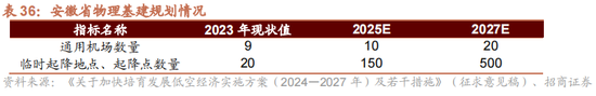 以安徽省给出的发展办法来看,安徽省考虑到 2025年,建设 10个傍边通用机场和150个傍边临时起降时局、起降点,部分区域低空智联基础设施网初步形成。到2027年,建设20个傍边通用机场和500个傍边临时起降时局、起降点。