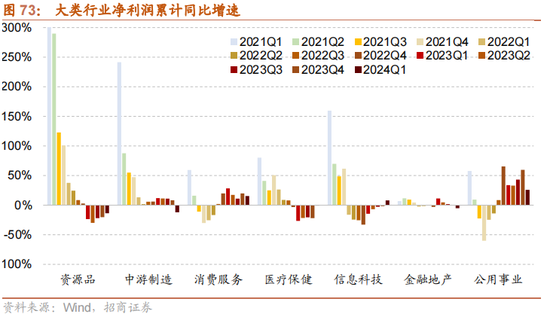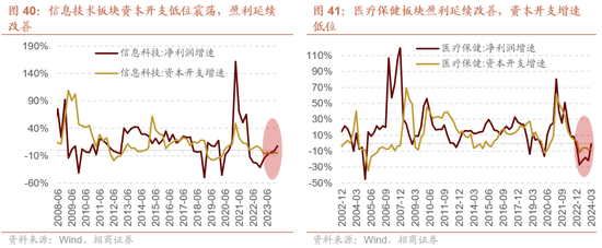 蔓延增速窄幅波动:信息期间、医疗保健。信息期间板块盈利自2022年底以来无间改善,2023年二季度板块成本开支增速见底,随后窄幅朝上波动,2024年一季度降幅收窄至-4.5%。医疗保健板块此前盈利和成本开支增速均经历了较万古分收缩,目下处于盈利底部涟漪,一季度净利润增速降幅收窄至-0.9%,成本开支增速降幅稍许扩大至-7.3%;