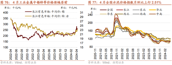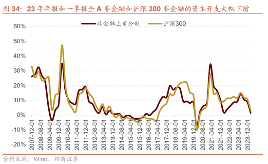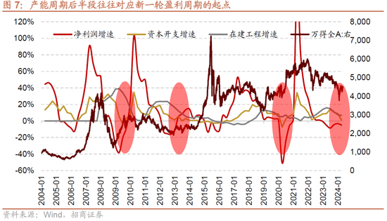 上市公司盈利周期一般最初于产能蔓延周期,盈利改善之后,不时会有企业扩产意愿提高。当产能蔓延较多,供过于求,企业盈利下滑,企业扩产意愿也逐步收缩。而产能周期的后半段,跟着产能收缩到一定程度,盈利逐步改善,不时对应着新一轮盈利周期的启动。本轮非金融上市企业成本开支增速在2023年二季度达到高点,随后增幅逐步收窄,2024年一季度收窄至1.3%,基本对应本轮盈利的低点。