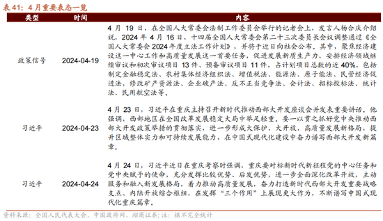 4月重要表态方面,主要聚焦新质坐褥及西部灵通发。1)新质坐褥力:4月19日,在寰宇东说念主大常委会法制管事委员会举行的记者会上,发言东说念主杨合庆先容说,2024年4月16日,十四届寰宇东说念主大常委会第二十三次委员长会议调整通过《寰宇东说念主大常委会2024年度立法管事考虑》,并将于近日向社会公布。其中,聚焦经济建设这一中心管事和高质地发展这一首要任务,促进发展新质坐褥力,安排经济领域连续审议和首次审议形貌13件、打算审议形貌11件,占考虑形貌总额的近40%,包括制定金融结识法、农村集体经济组织法、增值税法、能源法、原子能法、民营经济促进法,修改矿产资源法、企业歇业法、反不梗直竞争法、管帐法、招标投标法、统计法、民用航空法等。2)西部灵通发:4月23日-24日,习总通告在重庆主理召开新期间推动西部灵通发茶话会并发表重要语言及调研时,要点强调西部地区在寰宇更始发展结识大局中举足轻重。要一以贯之抓好党中央推动西部灵通发政策举措的贯彻落实。
