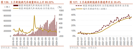 3月新能源车销量和能源电板装机环比上升,充电桩保有量稳步上行。Wind数据自大,3月新能源车销量88.28万辆,环比上升85.22%,同比上升为35.26%,浸透率升至35.4%;3月能源电板装机35,000兆瓦时,同比上升25.8%,环比上升94.44%;3月充电桩保有量290.89万个,同比增长48.55%。