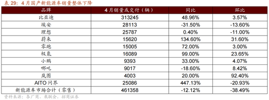 4月国产新能源销量合座下降,环比下降12.12%,AITO问界、蔚来同比大涨。第一梯队来讲,比亚迪、埃安4月销售量分别为31.32万辆、2.8万辆,分别环比上升3.57%、下降13.60%。第二梯队车企及部分新势力车企4月表现比较祈望,祈望环比下降11.00%、蔚来环比上升31.60%,零跑、极氪、小鹏4月销量环比上升分别为3.00%、23.65%、4.07%。AITO问界和蔚来表现亮眼,同比大涨。4月份,AITO问界4月请托25,086辆,同比大增447.13%,环比减少-20.93%。蔚来请托新车约15,620辆,同比增长134.60%,环比增长31.60%。