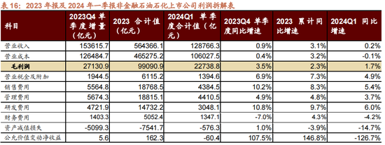 A股23年年报事迹降幅收窄,延续改善趋势,24年一季报事迹承压,增速负值再次扩大,企业盈利收复仍较为周折。凭证一致可比口径和合座法测算,全A2024Q1/2023年报净利润增速为-4.3%/-1.3%,非金融石油石化2024Q1/2023年报净利润增速为-5.6%/-3.9%。收入端,全部A股23年年报收入端增速收窄,24年一季报收入增速转负。非金融/非金融石油石化增速均有所收窄。