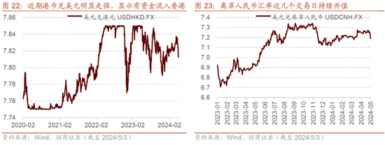 东说念主民币和港币在这一轮好意思元走强流程中,均保持了相宝石重。而4月22日以来,港币兑好意思元、离岸东说念主民币兑好意思元显耀走强,港币兑好意思元4月22日以来增值1.2%,离岸东说念主民币兑好意思元增值0.8%,自大有资金无间流入港币和东说念主民币资产。