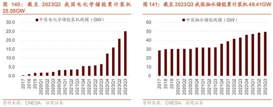 储能范围不断提高。限制2023年第三季度,我国电化学储能累计装机25.05GW,同比高增279.5%,抽水蓄能累计装机49GW。