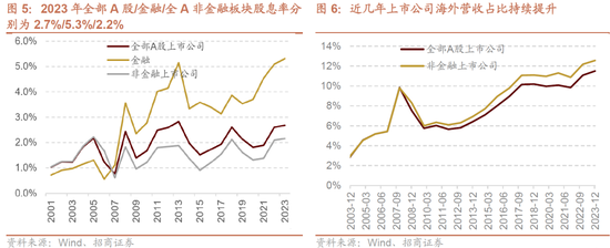 上市公司国际营收占比进一步提高。2023年全部A股/非金融上市企业国际营业收入占总收入的比重分别为11.5%和12.6%,最近三年相比2018年至2020年,全A/非金融国际营收占比的均值分别由10.1%/11.1%提高至10.8%/11.9%,将来出海有望成为重要增长能源;