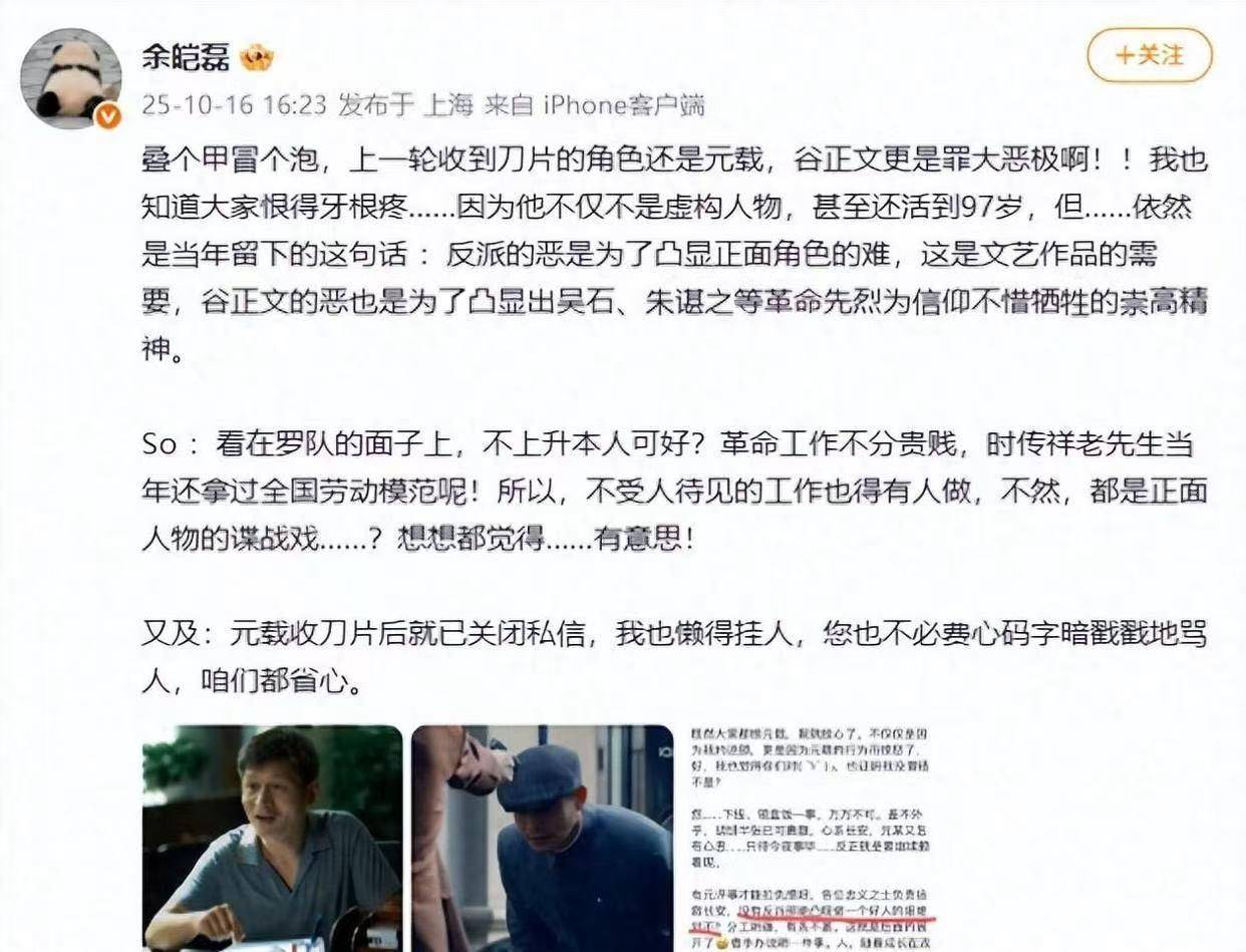 而演员余皑磊本东谈主被骂惨后也很无奈,速即发文表露求放过,我方承认这个扮装招东谈主恨,但这只不外是东谈主物本人,邪派的恶恰是为了突显正面扮装的难,再等于本东谈主说明私信已关,因为之前曾经出现过因为扮演邪派扮装被网友追着骂的情况,是以自从前次早就关闭了私信。好家伙,这依然是“惯犯”了吧