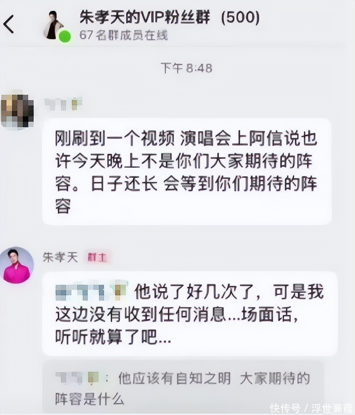 在阿信公开表态不久后,一张朱孝天在私东谈主粉丝群内的聊天记载在集会上泛泛传播。