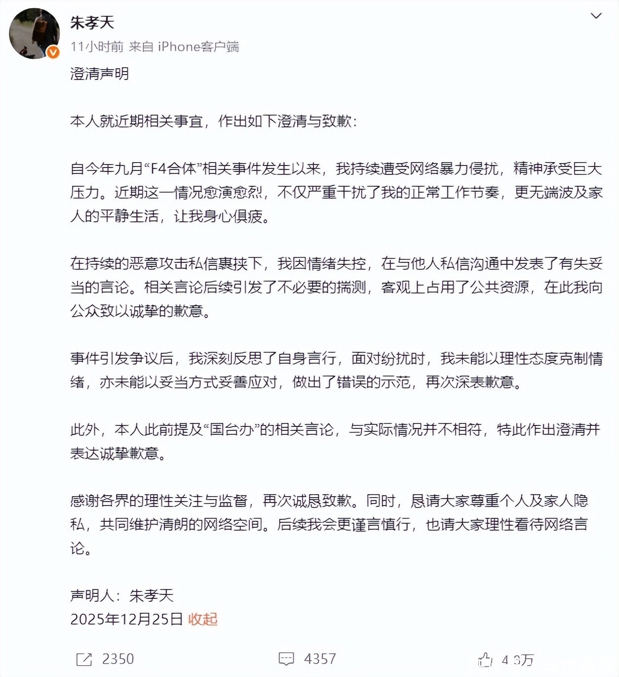 爆料发布次日,朱孝天蓦然发布谈歉声明,全面除掉此前整个指控。