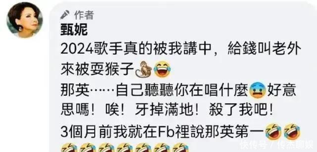 跟着《歌手》第别称花落那英手中,各式质疑之声随之而来。这不,曾演唱《铁血忠心》《鲁冰花》的香港70岁女歌手甄妮也为此发文暗示,2024歌手真的被她提前说中了,给钱叫老外来恶果把东谈主家当耍。三个月前就展望那英是冠军!