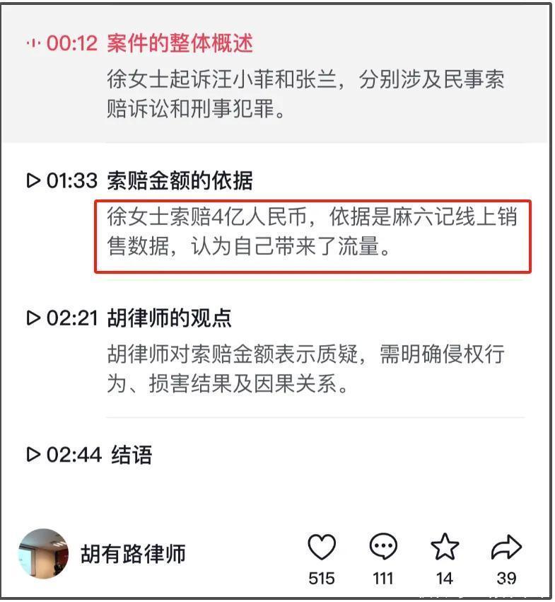 ——大S向汪小菲民事索赔高达4亿东谈主民币。而这个金额是基于麻六记从开发到如今所产生的线上销售数据所得出的,胡讼师称大S认为,麻六记能有当今的获利,最大的功劳是因为直播的本领应用了大S的流量。