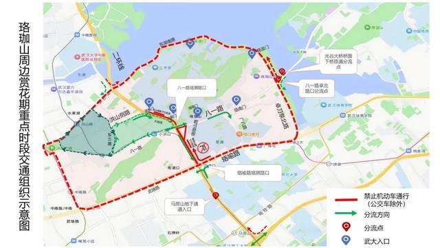 珞珈山附进赏花期重心时段交通组织默示图。