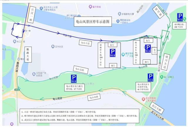 1.四大泊车场:龟山景区北门露天泊车场(17泊位)、国棉泊车场(350泊位)、晴川泊车场(500泊位)、洗马长街泊车场(45泊位)。龟北路有3个进出口,老友正途有2个,晴川正途有2个。